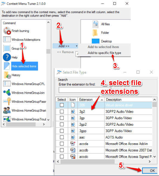Step 3: Repeat step 2, but this time after pressing the Add button, you have to click Add to specific file type option. A new window will open where you will see the list of file extensions. I believe all the file extensions that are supported by Windows (such as TXT, RTF, 3GP, AVI, and lots more) are visible in this window. Select the extensions for which you want to show ‘hide selected items’ option in Context menu.
