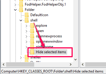 Step 4: Go to: HKEY_CLASSES_ROOT → Folder → shell. Create a new key under shell key and set its name as “Hide selected items“.