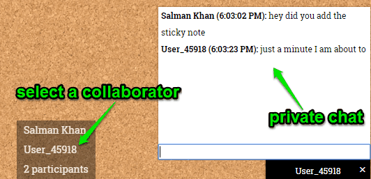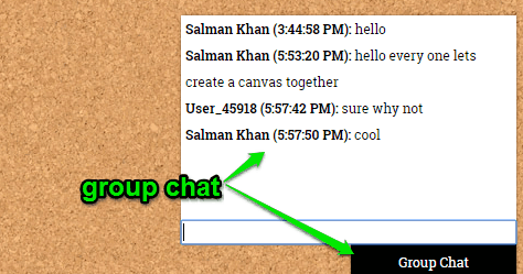 Another interesting and useful feature of Pinup is that you can chat with the collaborators by sending text messages. The best part about the chat feature is that you can either have a group chat with all the collaborators or you can start a private chat with any of the collaborators. To start a group chat, you can simply click on the “Group Chat” option visible at the bottom right corner. As soon as you do that, a chat window will appear and you can have conversations with all collaborators.