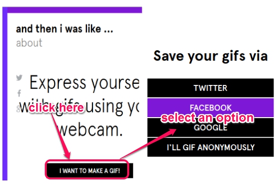 ‘And then I was like‘ is a free service that helps to online create animated gif using your webcam. You can create as many Gifs as you want, can save, and share your animations to people or with friends. Now-a-days, animated Gifs are very popular to share funny moments, remarkable points, and for many more things. This free service also plays a good part to upload and share any video recorded with your webcam in form of animation. Although, it lets you record 3 seconds video only. But this is sufficient to give a message, like about your new haircut, a big achievement, or anything else.