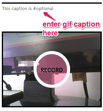 You also need to allow permission to use your webcam for recording. Immediately after this, Record window will be in front of you, just like visible in screenshot below. In this window, tap on Record button, and on the count of 3, recording will start. A caption can also be inserted for gif, if you want. You have only 3 seconds to create a meaningful gif, so position your webcam at right place.
