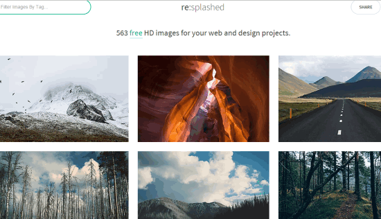 re:splashed makes browsing and downloading Unsplash photos very easy. This website provides images with tags and comes with search option to filter the images by tags. So you can click on any tag (say rocks, trees, etc.) or filter images by tags and then click on preferred image to download it to PC.