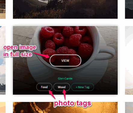 Apart from using search box, you can hover mouse cursor over any image, and see the tags of that particular image. See the screenshot below. To view a particular image, place mouse cursor over that image. View option will be visible. Apart from view option, you can also see the owner/photographer name. Clicking on View option will open the image in full size in a new tab.