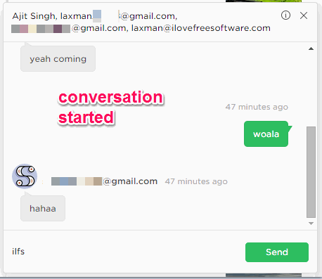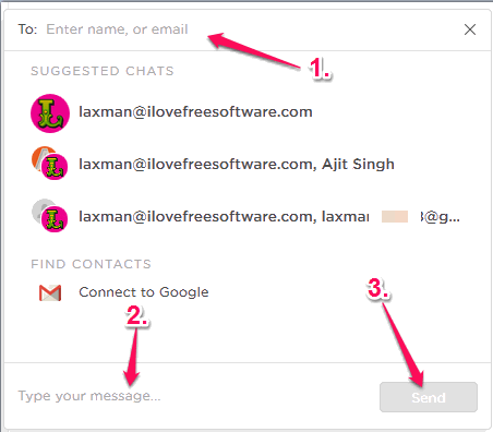 Step 3: In the chat box, enter the name or email address of a person to send the message. See the screenshot below. You can add multiple addresses when you want to start a group chat. Now on the bottom part of chat box, you can type your message and send to recipients.