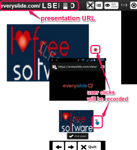 Also, clicks made by people on presentation will also be recorded. See the below screenshot. It is one of the best use of this service. For example, if you have a quiz like presentation, then you could record user clicks. From recorded clicks, you can find out how many people gave the correct answer or wrong answer.