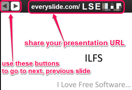 EverySlide is a handy online service that lets you share the presentation with people and start a poll (say an opinion poll) together. Sharing a presentation and polling is done with real-time syncing. That means, when you will turn the slide of your presentation, then next slide will automatically be visible to rest of the connected people. You can upload a PowerPoint or PDF presentation file, and then a unique link will be available for sharing that presentation. It doesn’t matter whether users are working on PC, tablet, or having a smartphone. They can open the link and see the presentation.