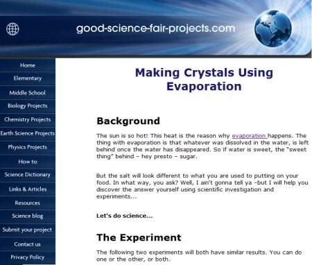 Good Science Fair Projects is another popular website that helps you get Science project ideas. The navigation tab has been categorized into various types of science projects such as Middle School Science Projects, Biology Projects, Chemistry Projects, Physics Projects, Earth Science Projects, and more.