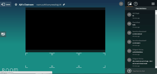 Room is a free online video chatroom, that comes with Screen Sharing, Video Chat, Voice Chat, and text chat. You only need to go the Room’s website and you will be able to create chatroom instantly. It does not require any registration, downloads, plugins, or any other annoyance. On creating the chatroom, you will get a URL which you can share with anyone with whom you want share screen or have video chat. The website supports addition of up to 3 users to your chatroom.