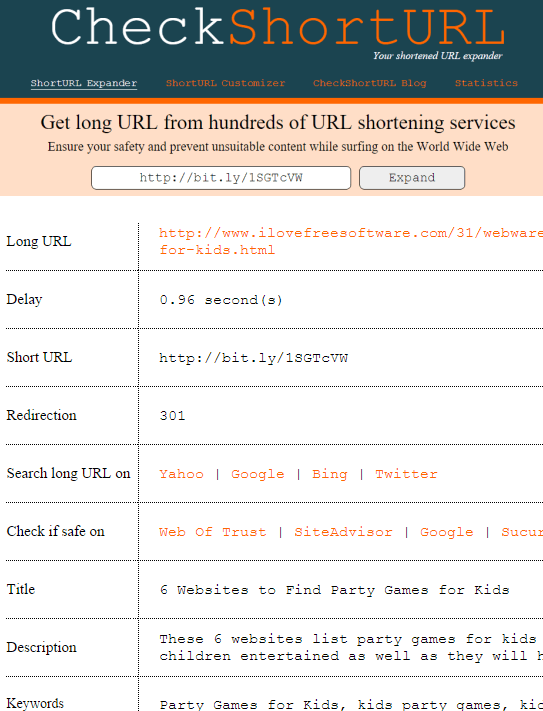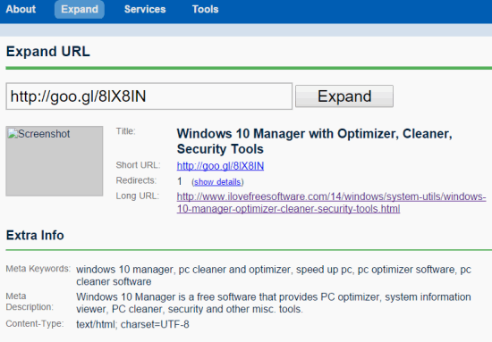 LongURL is another good website to expand the short URL and grab the original URL. It also shows extra information related to the short URL. For example, you can see the meta keywords used for the content of that URL, meta description, and type of content (HTML or Text).