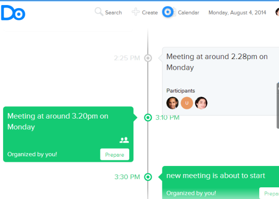 Do is a free online meeting organizer that helps to create and schedule meetings. It provides timeline view of organized meetings to let you keep track of past and future events. You can also keep track of your Google calendar meetings or events in timeline. Benefit of this website is that whatever event will be created by you is visible to timeline and your Google calendar list, and vice-versa. Only your Google account is needed to use this meeting organizer website.