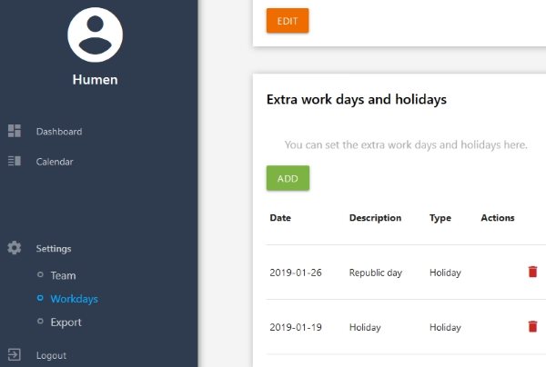 The owner of the app can also add extra work days, or holidays in the calendar. Go to settings tab and choose workdays from there. In workdays section you will be shown regular work days and you will get an option to add extra workdays or holidays. As soon as you enter extra holidays or workdays it will be reflected in calendar for everyone in your team.