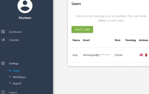 In this form you have to fill in the name of the team member, his or her email ID, define their role in the company, and choose a vacation count for them. In the role field you can choose from admin, owner, HR, and Co worker. When done click on invite button. This will send a invite to your team member on their email.