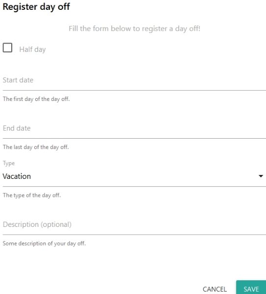 In this form, you can register for a day off. You will have to enter the start and end date for your vacation. If you are taking only one day off then you can enter the same date in both the fields. Choose the type of vacation from the drop down. The options you get are vacation, home office, sick leave, and unpayed vacation. You can also mark a half day by choosing the check box given at the top of this form. Now click on the save button given at the bottom. This will save your vacation and reflect it in the calendar, as can be seen in the screenshot below.
