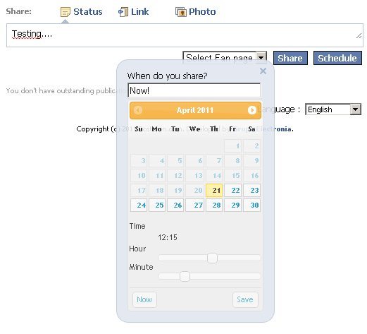 Postcron is a free web application to schedule Facebook status updates before hand. This web application allows you to share links, images, text with your entire friends list on Facebook. Also you can schedule updates for any pages you created or own on Facebook.
