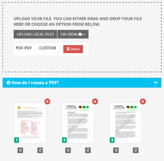 PDFResizer.com is a multipurpose website that comes with its separate feature (here is the link) to rotate PDF online. Its has two unique features: you can batch rotate PDF files and select the page range to rotate PDFs. The maximum upload size for a single and multiple PDF files is 100 MB. Also its PDF page range feature works in a bit different way. If you have selected page 1 to 5 for rotation, then it creates the output PDF of only those rotated pages. So instead of providing the full output, it will generate output of only rotated pages.