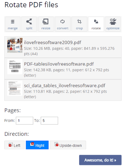 Rotating PDF online using PDFResizer.com is very easy. When you upload PDF files from PC, you will be able to see the size, pages, and page type (A4, Letter, etc.) of each PDF file. After that, you can select rotation type, set page range if needed, and then use “Awesome, do it” button for rotation. When PDF files are rotated, you can download them one by one.