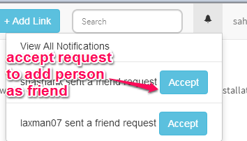 This is a valuable feature to automatically view links of other users on your dashboard. But that user(s) must be your friend. For this, you can use search box to search a particular user. If that user has an account in this website, send him/her your request. He/she can view notifications to see the request. Once the request is accepted by that person, you both will be able to see each links added by each other.