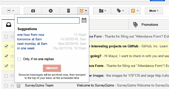 Streak is a Chrome extension that manages your Gmail. It is basically a CRM integration with your Gmail. Streak provides you the means to snooze your emails. To snooze emails, you have to tick mark the emails. After that, click the orange ‘clock’ button and specify the time you want to snooze emails to. The snoozed emails are placed in the created ‘Snoozed’ label.
