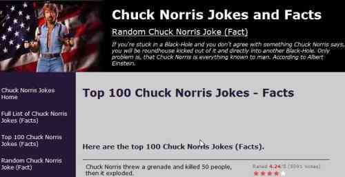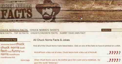 This website is referring to Chuck Norris facts as jokes; hope Chuck Norris is not reading otherwise he’ll roundhouse kick this website. These are indeed facts about a man who can do anything. Jokes apart, the website has a good compilation of Chuck Norris Facts, and they can be browsed by newest, top 100, etc. categories. You can also submit your email address to receive the facts through email. Apart from this, you can rate the facts on a scale of 1 to 5, depending upon your liking. You can also submit your own Chuck Norris facts to the website.