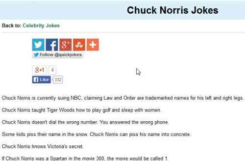 The website has lots of jokes on a lot of topics, including Chuck Norris. The Chuck Norris jokes page has a long list of jokes, which you can scroll through and read. That is pretty much all that you can do with the website.