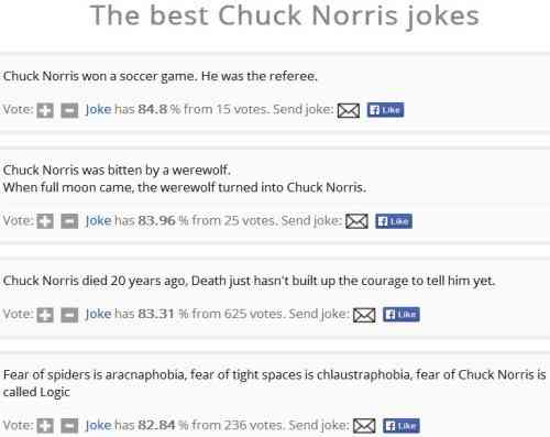 Another jokes website which has an entire section of Chuck Norris jokes. The jokes are neatly laid out on the page, as can be seen on the screenshot above. Each joke has a vote option under it, where if you like the joke you can click on the plus sign and if you don’t then click on the minus sign. You can also email the joke to your friends by clicking the email icon or press the Facebook button for liking and sharing it with your friends on Facebook.