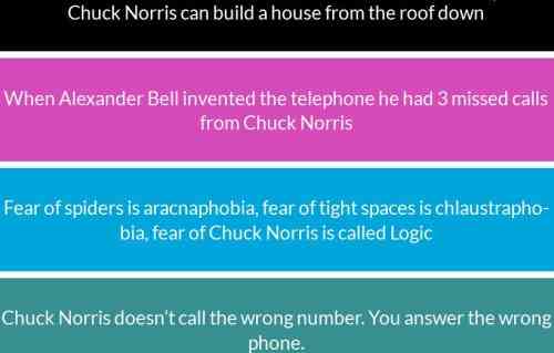 The website has a section on Chuck Norris facts. You can scroll through the page and read all the facts. I liked the layout of the facts, they all have a different background color and the font is on the bigger side to make reading easy for you. The screenshot of this layout is shown above. You can also use the submit fact tab to submit your own fact to the website.