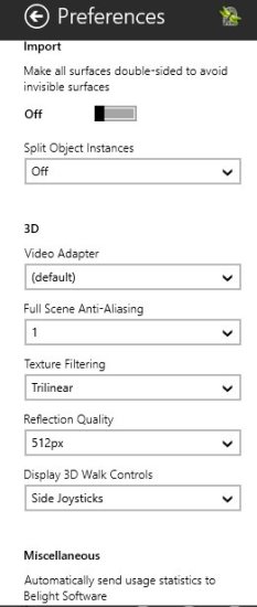 As shown in the screenshot above, you can add items like couch, chair, plants, decoration pieces, paintings, lamps, curtains, etc. to your current design. The settings page of the app allows you to tweak a few settings as shown in the screenshot below.