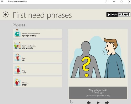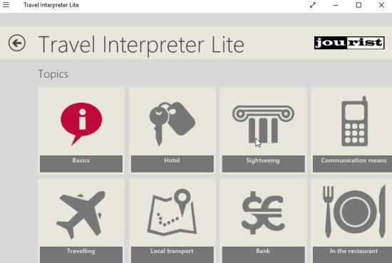 Travel Interpreter Lite is a free Windows 10 Language Translation app to translate commonly spoken phrases when traveling to another country. The app can translate 270 of the most common English words and phrases into 32 languages. The app lets you choose from various categories like basics, local transport, hotels, sight seeing, etc. You can see how to ask for a certain thing in the native language of the country you are in. The app will make it easy for you to communicate in another country with a different native language.