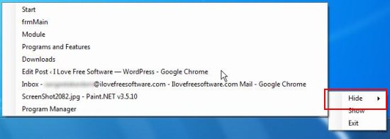 UDWA Window Hider is very easy to use. Just make a right-click on the system tray icon of the software and look at the context menu. There you will see a “Hide” sub-menu. Click there to open the list of currently opened windows on your desktop (including programs, applications, and folders). Choose the desired window that you want to hide.