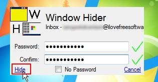Now what happen next, a prompt window will appear asking you to enter a password using which you can lock the window. You can either enter a password to lock and hide windows, or simply check the “No Password” check box to hide windows without locking them.