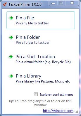 There are three different ways in which you can pin items using Taskbar Pinner. Lets have a look on each of these: