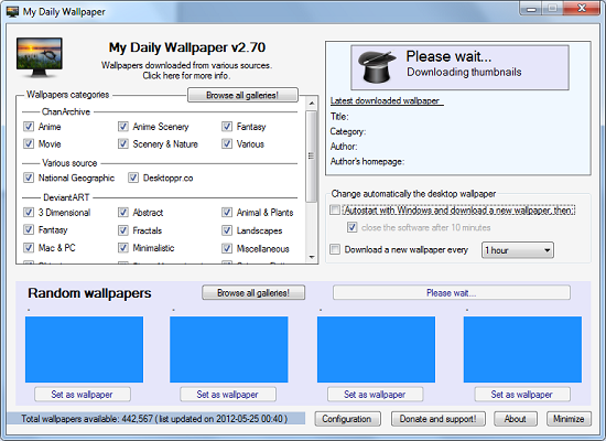 Wallpaper categories are listed based on databases they are downloaded from. Choose wallpaper categories you want downloaded to your desktop by checking the respective checkboxes. You can view even more wallpaper categories and galleries by clicking Browse all galleries. The program maintains a list of random downloaded wallpapers which you can use as wallpapers by clicking on the Set as wallpaper button of the wallpaper. You can change categories of random wallpapers by clicking Browse all categories and if you don’t fancy the random wallpapers currently available, you can download new ones by clicking the Download list of next random wallpapers. You can select the frequency of downloading new wallpapers by checking the Download a new wallpaper every checkbox and selecting a suitable frequency.