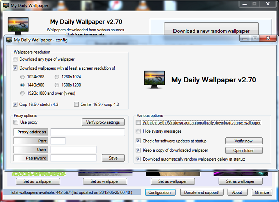 Program settings are accessible via the Configuration button. You can set what type of wallpapers to download and which to leave out. By default the program is able to detect your screen resolution but if you wish to change it you can select the desired resolution from the five options available. Also you can choose the crop and aspect ratio of wallpapers downloaded to correctly fit your screen. If you access the internet via a proxy server you can set proxy settings and click Save to store the configuration or click Verify proxy settings to make sure the application can access the internet without any issues.