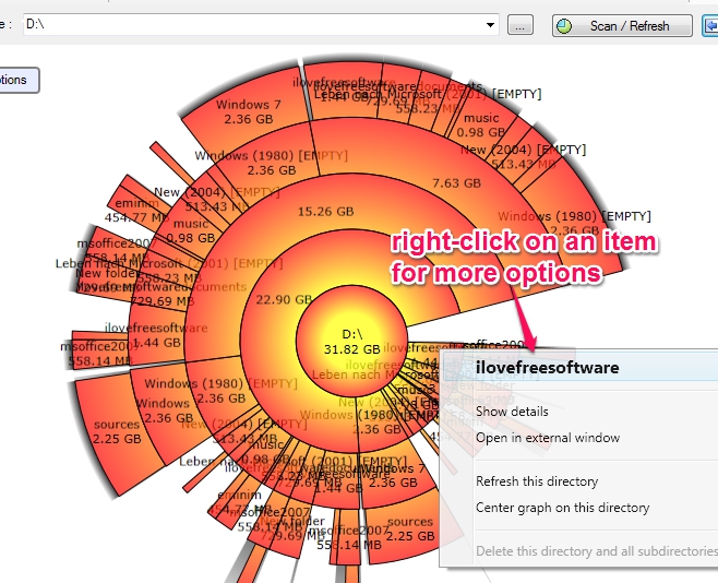 Immediately after using Scan button, a scan will be started for selected drive to find total space used by each item. Once the scanning will be completed, graph will be in front of you, just like visible in screenshot below. To view disk space usage by a particular item, simply place your mouse on that item, and item name including disk space use will be provided to you.