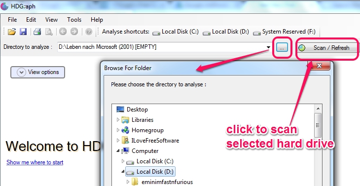 Interface of HDGraph is user-friendly. To find large files and folders, all you need to do is select a drive (hard drive or flash drive), and tap on Scan/Refresh button.