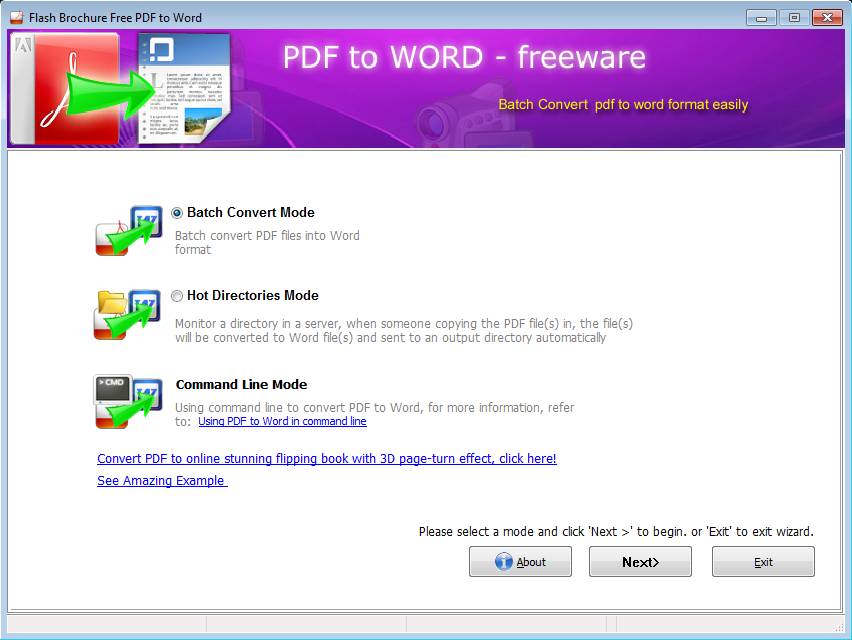 Flash Brochure Free PDF to Word is a free document conversion software for Windows which you can use to convert PDF documents to Microsoft Word’s document format, DOC. It comes with three different conversion types, batch conversion, where multiple PDF files can be converted at once, Hot Directories mode which offers automated conversion and the Command Line mode, where you’re using the command prompt for conversion.