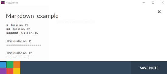 On the editor interface, you can enter a title and the color code of the note. The color code can be used to represent important, urgent or private notes, choose the color you like. Let’s start by making headers. Headers can be made by using ‘#’ at the starting of a sentence. More the hash symbols, smaller will be the header. Similarly, an underline made of ‘-’ symbol will also turn the text into a header.