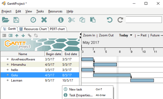 Step 1: Download GanttProect from the link provided above and install it. Its main interface is shown in the screenshot below. Now, get started by adding some tasks to your project; right-click on the interface and then select “New Task” option. A new entry will then appear in the left sidebar to add the task. You need to specify the task name, its start, and end date.