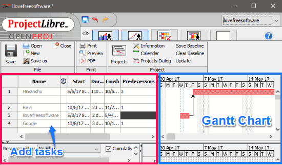 Step 2: Add tasks: In this step, I will tell you how you can add project tasks in ProjectLibre. The screenshot below displays the main interface of ProjectLibre on which you can add tasks of the project. For a task, you can specify the name of the person to whom the task is assigned, the start and end date of the task, predecessors of the task, and the resources. The duration parameter is automatically calculated as per the specified start and end date. The most important parameter among this list is Predecessors which define the next task to be completed when it’s finished. You can specify the task ID in the Predecessors list to define the dependency.