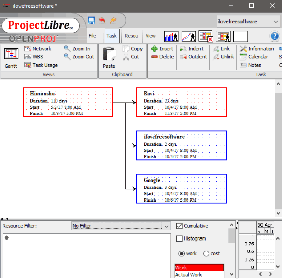 Now, select the “CPM Network” option from the left sidebar to see the PERT chart of the project as shown in the main screenshot of Open Workbench above. The PERT chart visually displays all dependencies between project tasks and states the start and finish date of a project. As I mentioned, there is no option to export the PERT chart unlike ProjectLibre, so, you will have to take its screenshot in order to export as an image.