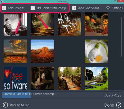 Go to its download page by clicking on the link available at the end of this review. Its setup file size is 252 MB. All its HD themes come with its setup. Install this software and open its interface. Now you have to follow few simple steps to create a stunning slideshow: