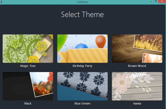 Step 1: Choose a theme for your slideshow. 6 themes are available to choose from: Birthday Party, Black, Magic Tree, Vanilla, Brown Wood, and Blue Denim. You can also preview a particular theme before selecting it. Preview video will open with your default web browser.