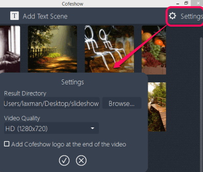 Step 5: click on Settings button to set the output quality and destination folder for your slideshow. You can select Full HD (1920*1080) or HD (1280*720) as output quality.