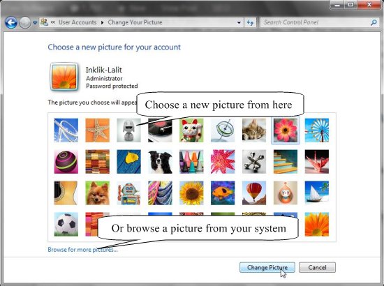 Step 4: In this window, you can select any picture that is being displayed, or click on “Browse for More Pictures” to select any other picture from your hard drive (including your own picture).
