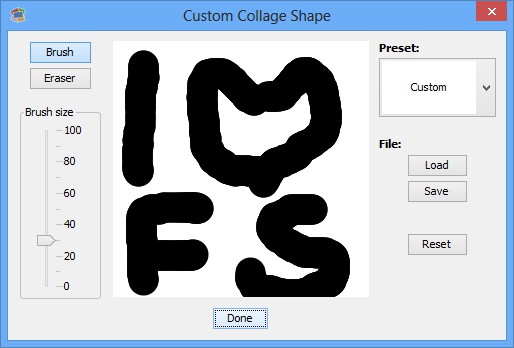 Shape Collage is a free collage maker that works on cross platform. As its name suggests, this is a shape collage maker which means that you can easily create collages of your favorite photo and images in any shape you want. Standard ones like rectangle, heart and circle are available and there’s even a custom shape option where your can draw a shape using a brush. You can even specify text to make collage in that shape.