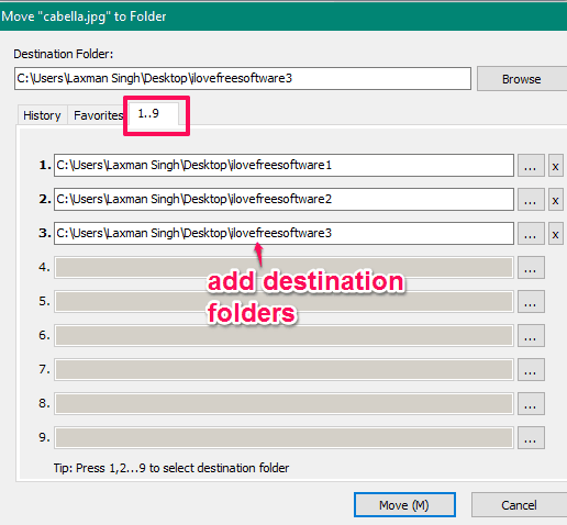 Step 2: Press ‘M’ button and Move to folder window will open. In that window, you need to access “1..9” tab. After that, you can add 9 different folders as output locations.