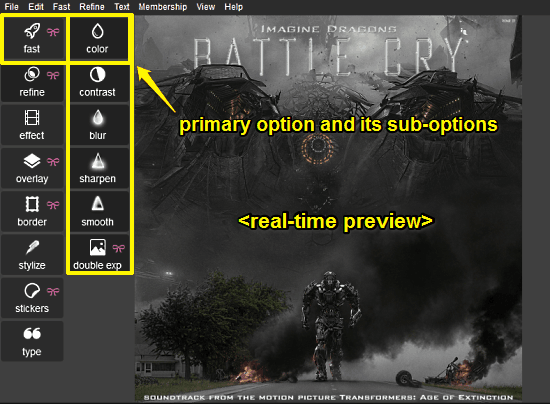 Step 2: Now, the next step is obviously to make the changes to the images. To do so, select one of the primary options, and then select a sub-option. For example, you can click on refine, and then choose from one of the options: color, contrast, blur, sharpen, smooth or double exposure. Once selected, you can also fine tune the way the editing operation is applied via sliders. Check out the screenshot below: