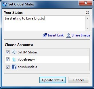 How do I my update status:  You can update all your network status from one place (even updates the IM’s status too). To do so just select which of the networks you would want to update your status as shown in the dialog below.