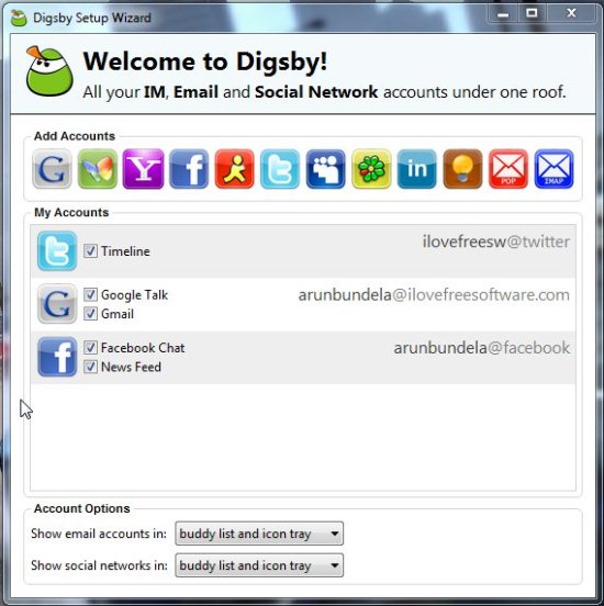 Digsby is a free IM client that lets you connect to many chat networks. Using Digsby, you can connect with GTalk, Yahoo Messenger, ICQ, AIM, MSN, and many more. Apart from chat networks, Digsby also connects with all popular social networks, like: Facebook, Twitter, LinkedIn, MySpace, and many more. And Digsby doesn’t stops there. It integrates with your email provider as well, like: GMail, and other POP3  / IMAP mails.