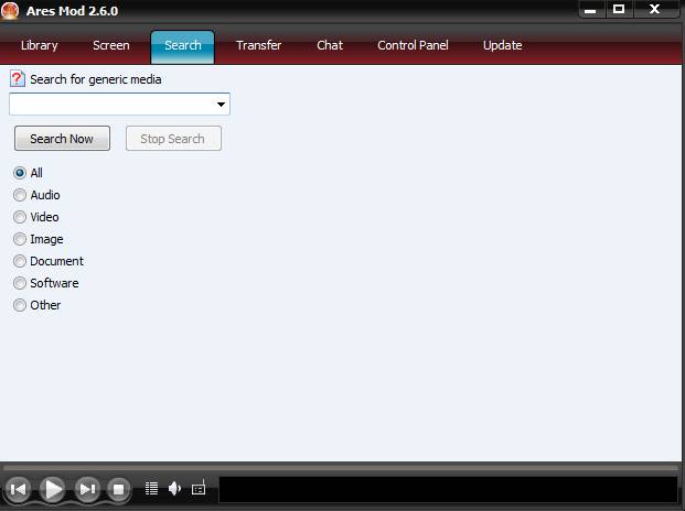 In the image above you can see the default interface of this free P2P software. It’s very modern looking, at the top we have tabs which can be used to switch between various different features that Ares Mod offers. Middle part of the window is where the actual interface of the feature that’s selected will present itself. At the bottom, media player controls are available where you can play multimedia which’s being downloaded.